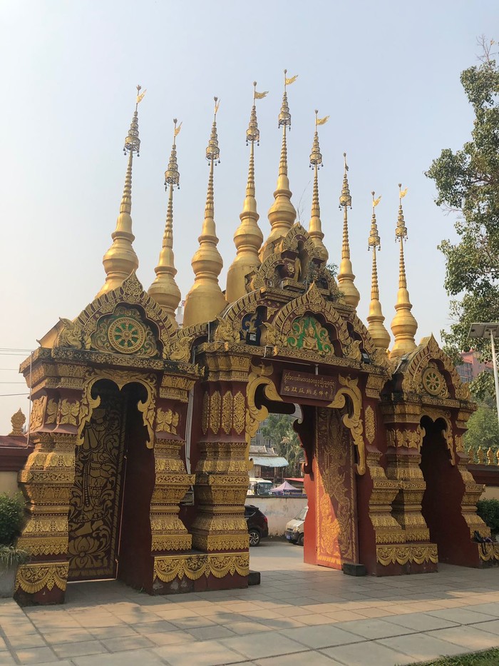 景洪大金塔,也称缅甸大金塔, 是当代新建佛塔(2010年建成),身高六十六点六米,寓意一江连六国,其中四小塔为实心塔。大塔为贝叶经博物馆。正中塔柱供奉着星期佛,供游人祈福。大金塔南北面都有大广场,广场四周还有好几处风格迥异的小塔建筑。