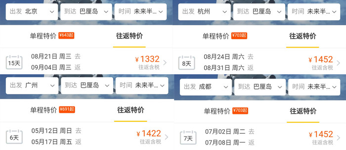 国内多个城市都有直飞印度尼西亚的航班,价格在1000元-2000元之间。