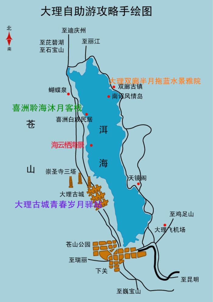 首先大致说一下 大理 的地理情况, 大理 这个地方那些景点主要都是环绕着洱海的,大致分为上中下,所以每个景点之间还是有点距离的,一般搭公交到不了全部景点。 双廊 、蝴蝶泉、 喜洲 就在“上”,古镇在“中”,洱海公园在“下”。最好的游玩方式就是租一辆马力十足的小电车或者自驾,不过一般租的小电车好像也跑不完全部景点。建议在这里呆3天也就够了。
