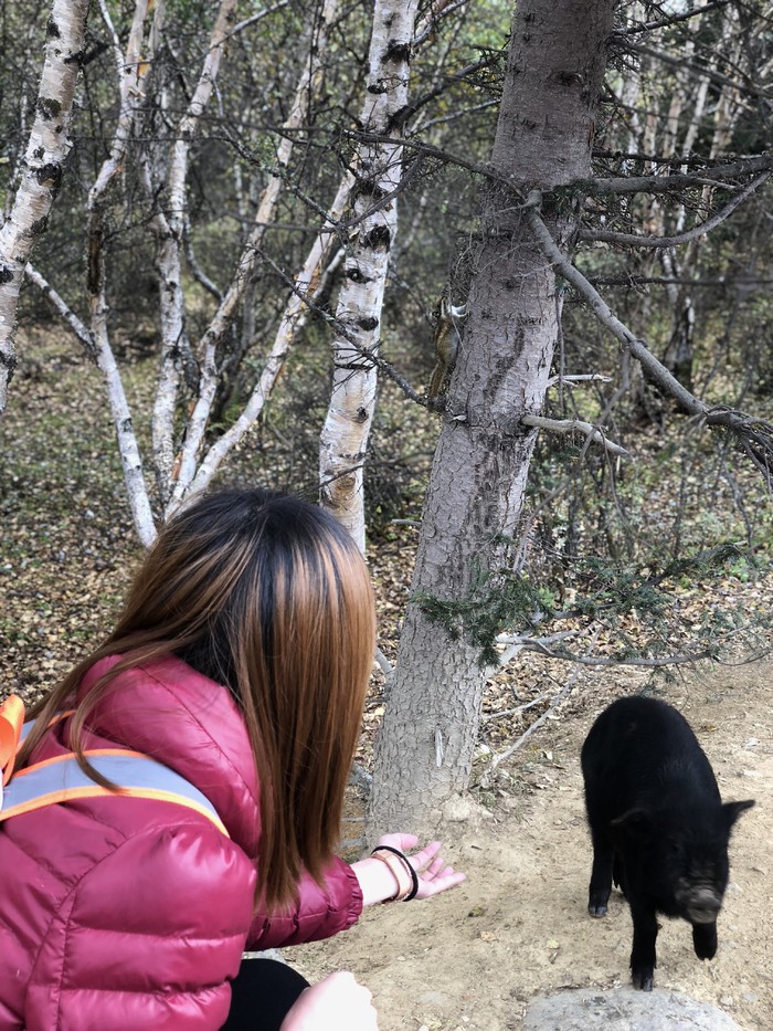 而且还会看到牦牛哦,还会看到很多的小松鼠还有黑猪,你拿食物吸引它们,它们就会过来了哈哈哈,特别好玩 ,所以一定要来普达措,太喜欢这里了