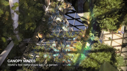 突破传统的设计理念,包含了两个风格不同的迷宫:树篱迷宫和镜子迷宫。