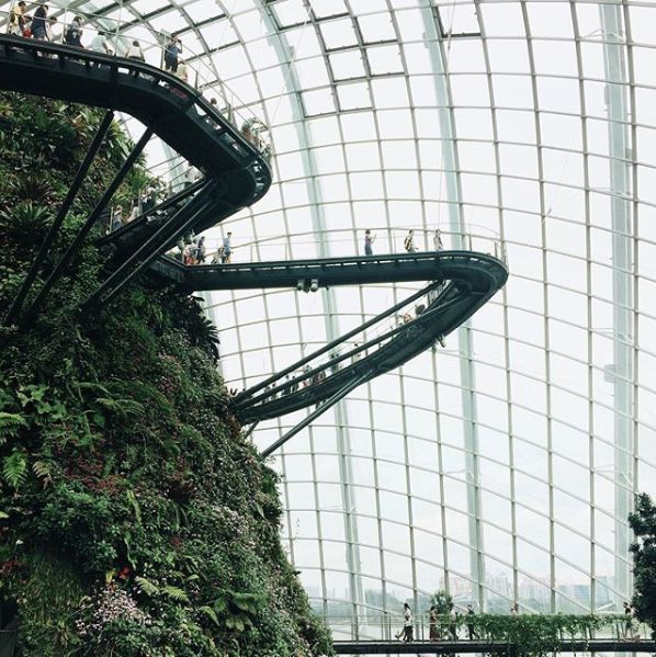 云雾林是新加坡滨海花园的一大特色,里面的人造高山和瀑布营造出的是一副世间独一份的仙境气氛。再加上富有现代抽象艺术气息的全透明外墙,仿佛穿越到百年之后的森林里。