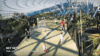 将一条250米长的弹跳网道和一条50米长步行网道融为一体。小朋友可以在弹跳网上嬉戏,大人则在步行网道俯瞰整个「星耀樟宜」内部。