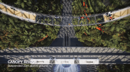 悬浮在23米高空,其中一段用玻璃替代。环绕公园50米长,可以一边欣赏瀑布一边寻找在空中行走的刺激感。