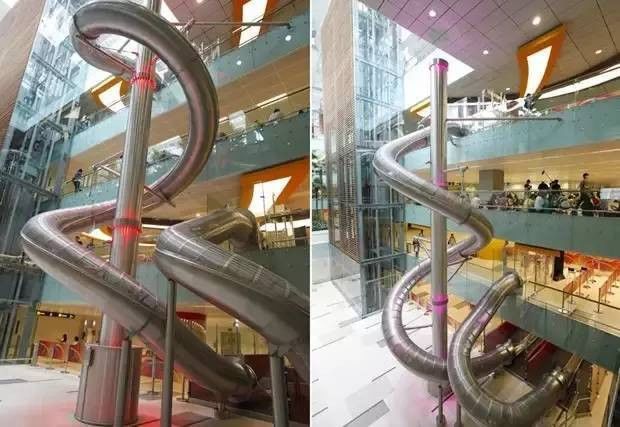 由四合一的滑道组成,两条管型滑梯和两条平面滑梯,本身既是一座宏伟的艺术雕塑作品,更是一项老少皆宜的游乐设施。孩子和大人都可以在这儿享受各种滑梯的乐趣~