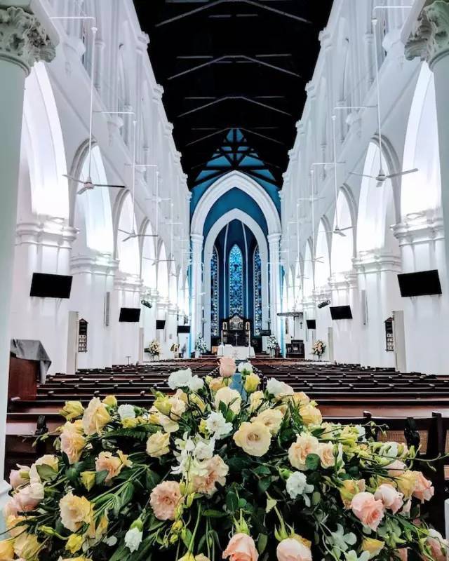 在克拉码头附近city hall B出口出来就是。一座洁白的哥特式教堂,高高的尖顶直插蓝天,很有贵族气质。很多新加坡当地的新人会选择在这里拍摄婚纱照。