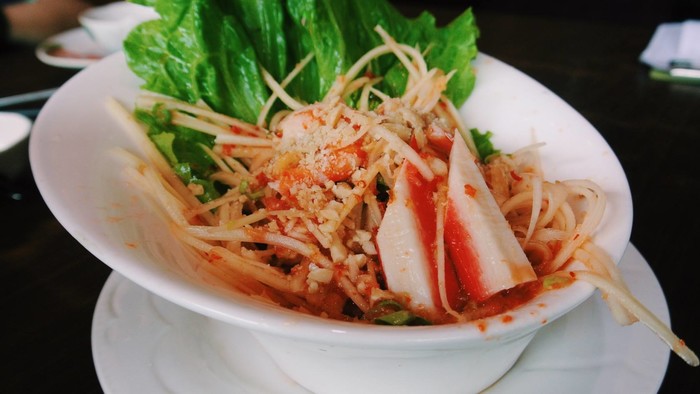 极受欢迎的泰国名菜,切块的红蟹加上配菜与咖喱和各式香料共炒,突出蟹肉的鲜味与弹性,风味独特。主料为泰国的青木瓜切丝,配料有青豆角、蒜头、虾米、西红柿、椰糖、辣椒等,再加入酸子汁及柠檬汁,整道菜香辣而带酸,口感爽脆,十分开胃。