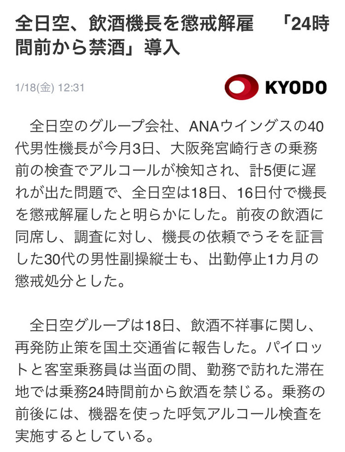 据日媒此前报道,全日空公司在1月18日曾发布声明,关于此前该集团一名机长在驾机前被测出喝酒并撒谎的问题,该公司已决定对其给予解雇处理。