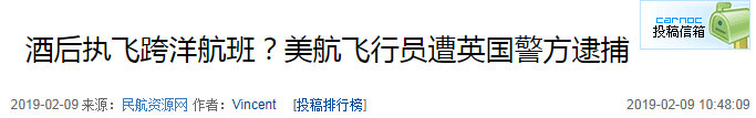 2月,一名美国航空飞行员因起飞前几分钟疑似醉酒,被英国曼彻斯特机场警方所逮捕。