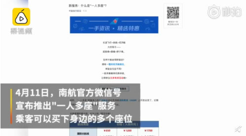 @财经网:4月11日,中国南方航空在官方微信号上宣布,一人可买多个座位,价格分三档,250元起。此服务已在广州始发的所有南航国际航班(非经停)上开放运营,但仅支持机场柜台购买,仅限经济舱。