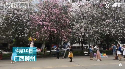 @中国新闻网:10日,广西柳州市种植的27万株洋紫荆花绽放。为了与紫荆花“亲密接触”,一些民众带上人字梯,爬到顶上与花朵“肩并肩”。有的人则抓住商机,在紫荆花盛放的道路出租梯子,附上“欢迎登梯拍照1元1人”等字样的牌子和支付二维码,不少游人掏钱登梯。