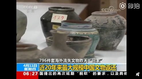 @中国新闻网:4月10日,796件套中国流失文物艺术品从意大利返回中国。11日,中国国家博物馆确认,这批文物已经抵京,国博将就此举办专题展览。据悉,意大利宪兵2007年在本国文物市场查获一批疑似非法流失的中国文物艺术品,中国国家文物局得知后,立即开展追索返还工作。经10余年追索,中国文物终"回家"。