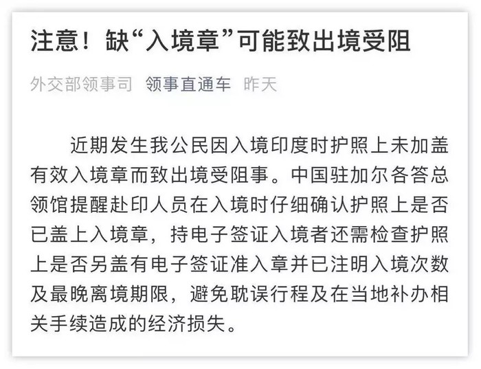 像这样入境时未盖入境章的案例,在中国游客入境越南、印度、埃及、印尼等地也时有发生。为此,驻外使馆还曾发布相关提醒。