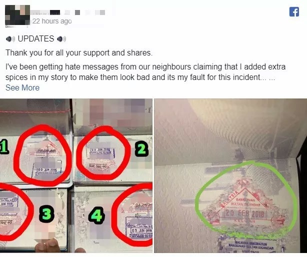 这位网友是开车离境的,他们离开关口才发现了工作人员的这个错误。等到他们到了新加坡关口,结果发现四个人的护照都盖错了章!后来在两名海关官员的陪同下经过一条特别通道,回到了马来西亚重新盖章。