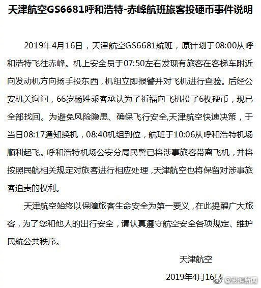 @澎湃新闻:16日,天津航空从呼和浩特飞往赤峰的GS6681航班上,一名66岁的乘客为祈福,向飞机发动机投掷6枚硬币,导致飞机需换机起飞。机组报警并进行查验,6枚硬币现已全部找回。呼和浩特机场公安分局民警已将涉事旅客带离,处以行政拘留10日处罚。