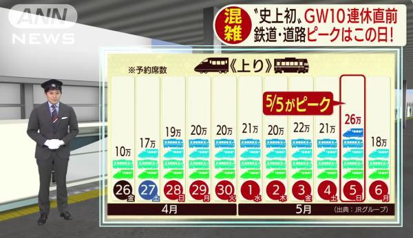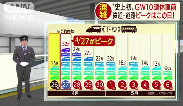 JR公布铁路预约座位情况,黄金周期间经已有436万席已预约,比去年多61%。首先是出行高峰期为4月27日,有32万座位已预约;而回程高峰期为5月5日,JR表示如想5月5日乘坐的朋友要尽快预约位置,而5月5日以外的空位仍然充足。