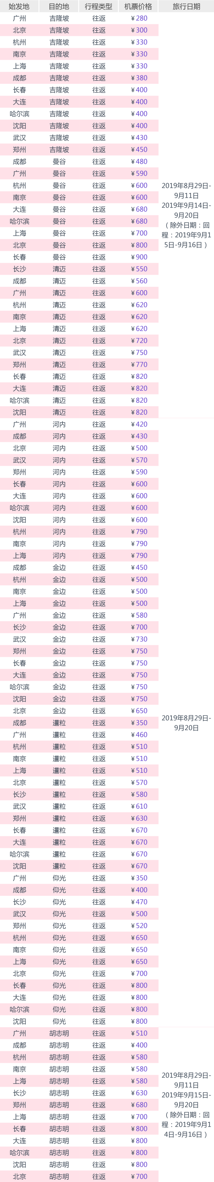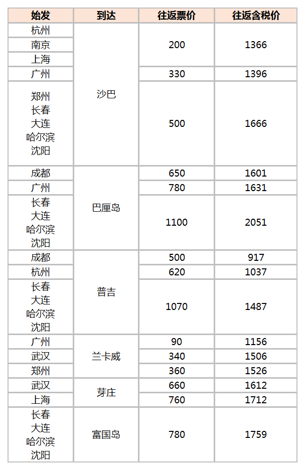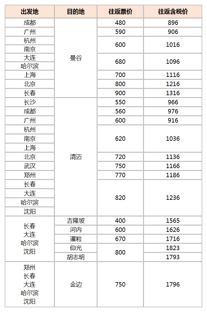 ①东北出发,往返东南亚各地价格都不错,值得入手