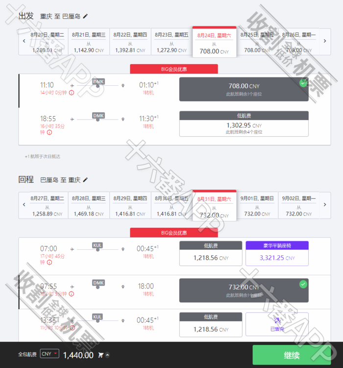 重庆=巴厘岛,8月末暑假票,含税1K4往返