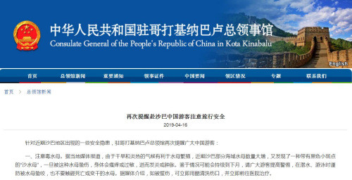 @中国侨网:据中国驻马来西亚哥打基纳巴卢总领馆网站消息,近期,马来西亚沙巴地区出现毒水母,以及交通事故等安全隐患。对此,驻哥打基纳巴卢总领馆再次提醒广大中国游客: