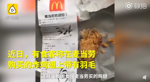 @头条新闻:4月21日,一女士称在北京某家麦当劳餐厅点了份外卖,在吃掉3块鸡翅后,自己女儿发现咬开的鸡翅竟带有多根鸡毛。目前,麦当劳官方已表示知悉此事并高度重视展开调查,同时该女士已向食药监部门举报。