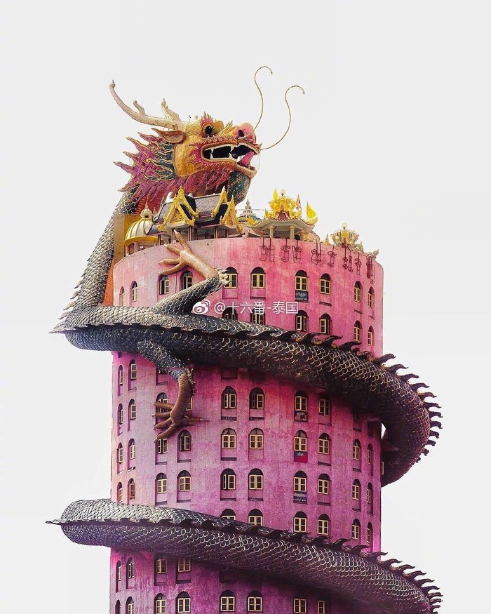 这座寺庙建筑为粉色外墙,50米高,外面盘踞着一条神秘的巨龙。这条"龙"栩栩如生,看上去非常壮观霸气,但是这条"龙"是空心的,游客可以通过它的身体一直爬到楼顶。