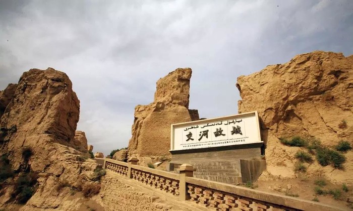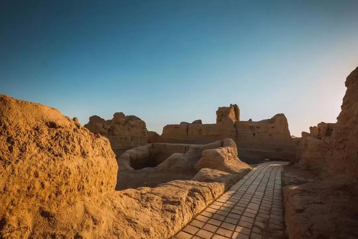 从吐鲁番市区西行10公里,经过几处古朴的维吾尔族村落,就到了交河故城。这是两河相拥环抱着的一座千年古城,从高处望去,更像一艘战舰孤悬在大地之上。唐朝诗人李颀在【古从军行】,曾这样描绘过交河:“白日登山望烽火,黄昏饮马傍交河。”黄昏与烽火,将交河点缀得沧桑落没,无边的斜阳,倾斜在土墙上....诗人眼中的边塞,有凄厉的风沙,有哀鸣的胡雁,有无止尽的寂静苍茫。