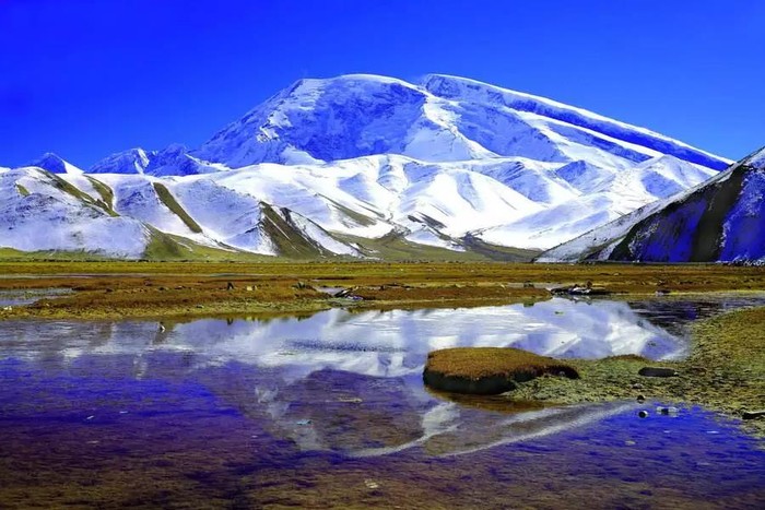 布伦口白沙湖曾是由慕士塔格峰东坡冰川的康西瓦河流经到布伦口一片宽阔地带后形成的沙滩河流。每到春夏冰川水流丰满时,这里就形成了湖面,而到秋季水流减少时,平坦的沙湖湖底露出水面,千条细水顺着沙滩向盖孜峡谷流去。