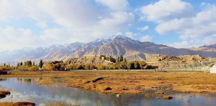 阿拉尔金草滩位于塔什库尔干县城东侧,塔什库尔干河两岸,占地面积20平方公里,属帕米尔高原上的一片湿地。因有塔什库尔干河流经此处,这里水草丰美,牛羊遍地,和远处的雪山白云蓝天交融在一起十分漂亮。我们去的时候夕阳夕照,碧绿的草滩一片金色,远处牧人白色的毡房,羊群都沐浴在夕阳下。