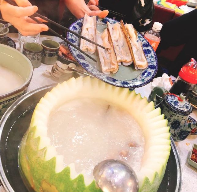 粥底冬瓜盅也是每桌必点,白粥打底,里面可以下各种海鲜,越煮越鲜!