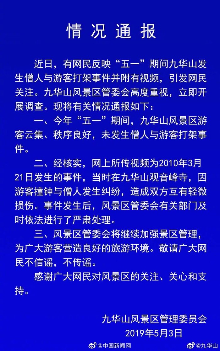 @中国新闻网:近日,有网友反映“五一”期间九华山发生僧人与游客打架事件并附有视频。九华山风景区管委会日前通报,今年“五一”期间,景区未发生僧人与游客打架事件,网传视频为2010年3月21日发生的事件,当时风景区管委会已及时依法进行了严肃处理。通报同时呼吁网友不信谣、不传谣。
