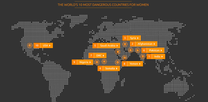 7年前,汤姆森路透基金会就同一主题开展过一次调查,在上次的调查中列出了对女性最危险的五个国家,分别是阿富汗、刚果民主共和国、巴基斯坦、印度和索马里。