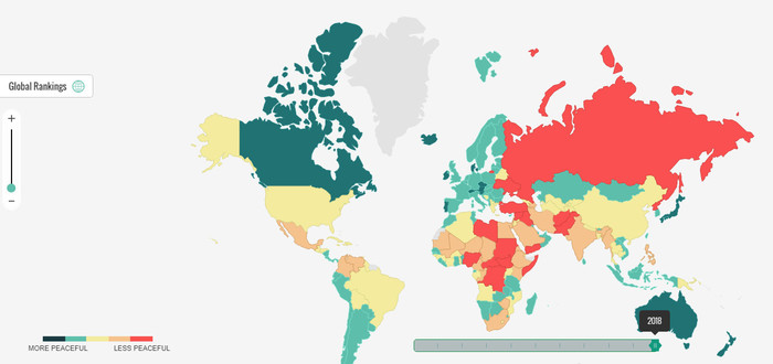 澳大利亚经济与和平研究所发布了2018年全球和平指数(Global Peace Index)排行榜(今年的暂未更新),榜单根据社会治安、安全系数、国内局势、国际冲突和军事化程度来作为评判标准,将全球163个国家和地区根据安全情况分为了五大类:和平系数很高、和平系数较高、中等、和平系数较低、和平系数很低。