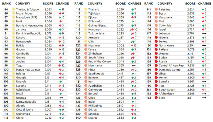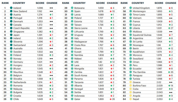 163个国家和地区排名如下面两张图。前10分别是:冰岛(常居榜首)、新西兰、奥地利、葡萄牙、丹麦、加拿大、捷克、新加坡、日本、爱尔兰。