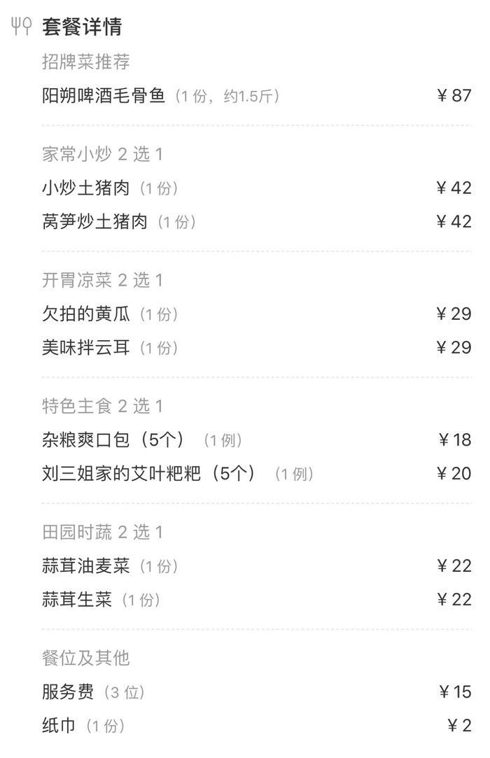 点了某团上148元的套餐,有五个菜,足够两三个人吃了。(估计是节假日的缘故,刚刚看了一下,某团上该套餐现在才128元)