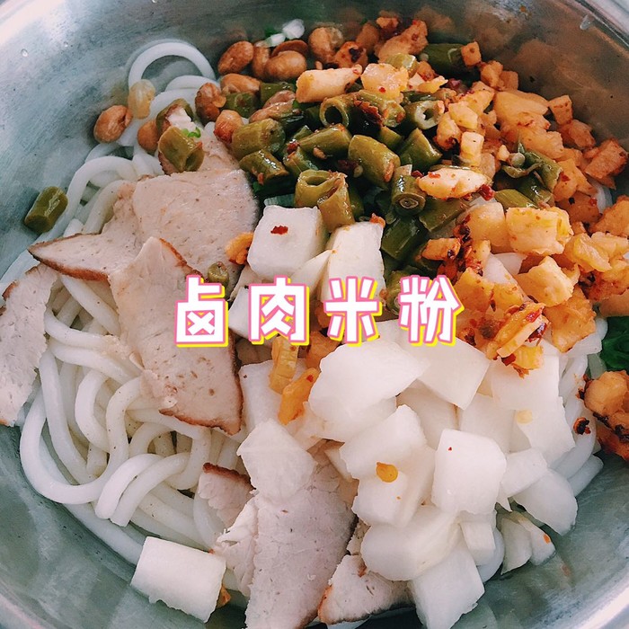 卤肉米粉和马肉米粉都是干拌的,自己可以加汤,小料也是自助添加。
