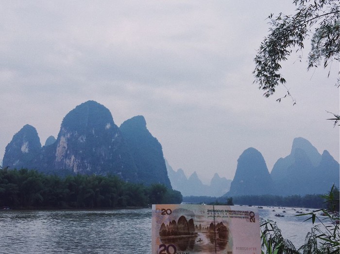 穿过兴坪古镇往北走,过一座小桥,沿着漓江一直往前走,一路上有好几个路标指示20元人民币背景图拍摄点。