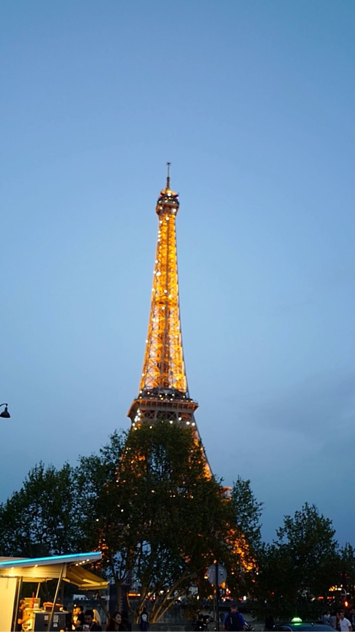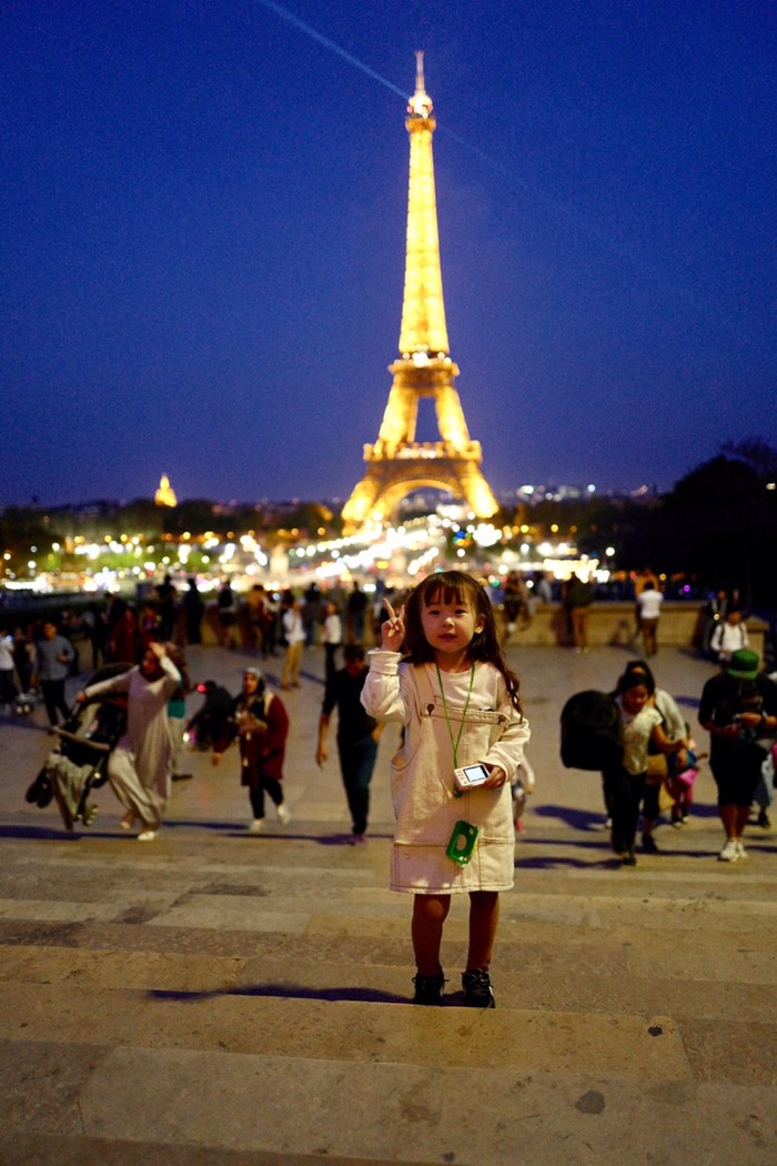酒足饭饱已经8点多,这边日落是近9点,9点整埃菲尔会灯光秀,坐了两站车赶紧过去,不然错过那就是下一个整点。出地铁走两步,塔就闪起来了,上次看还记忆犹新,昼夜的埃菲尔铁塔一硬一柔,很美。女儿直接脱口而出"The light show is colourful!"不错嘛学以致用。视频效果好些,图片没有闪耀效果。