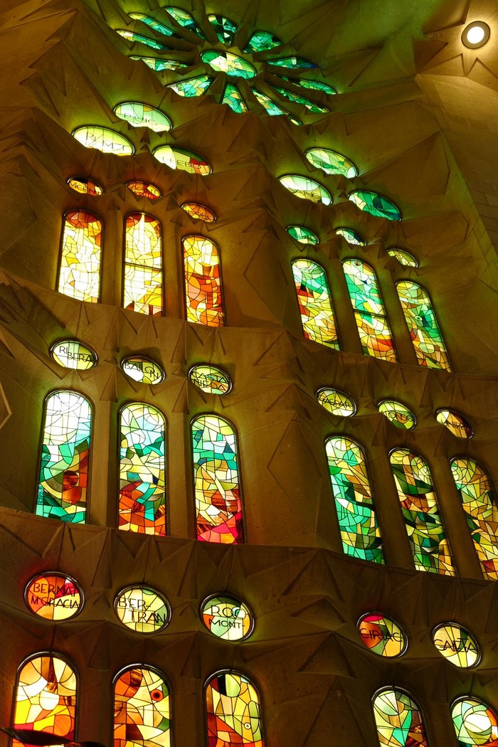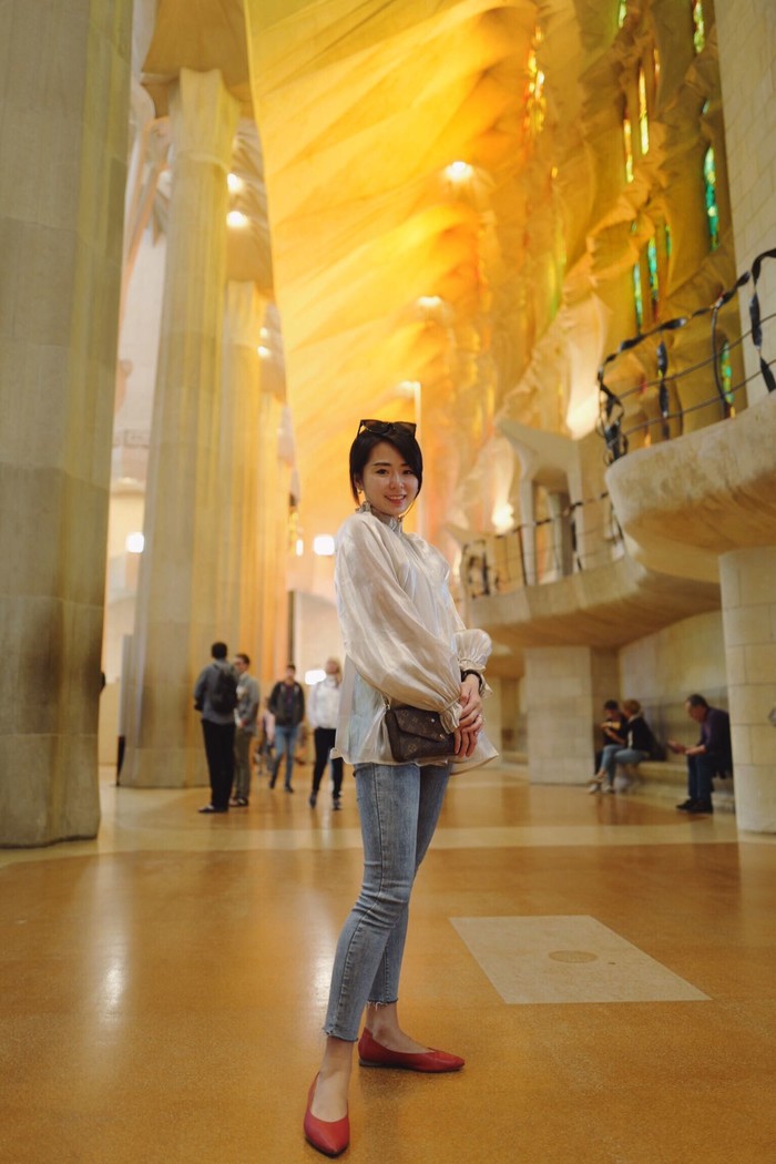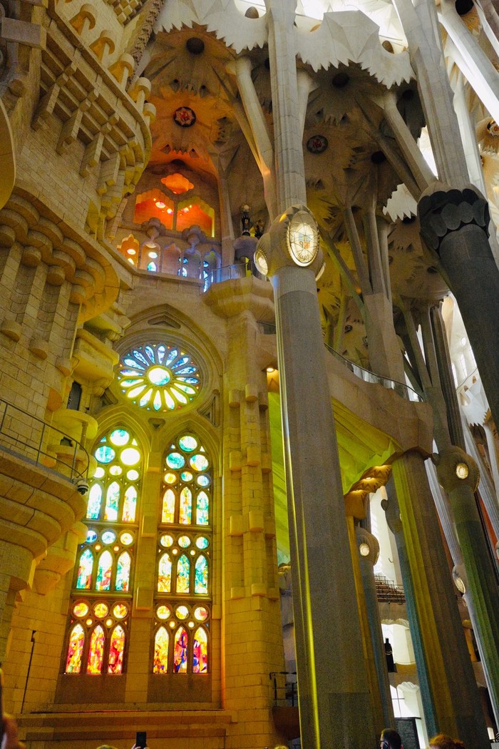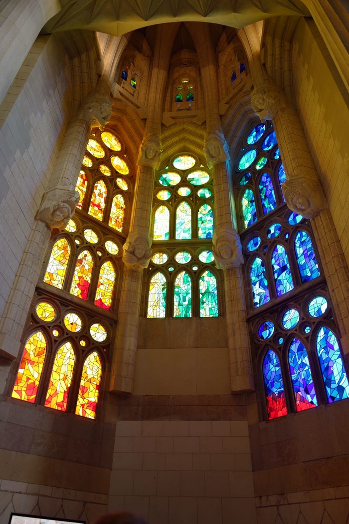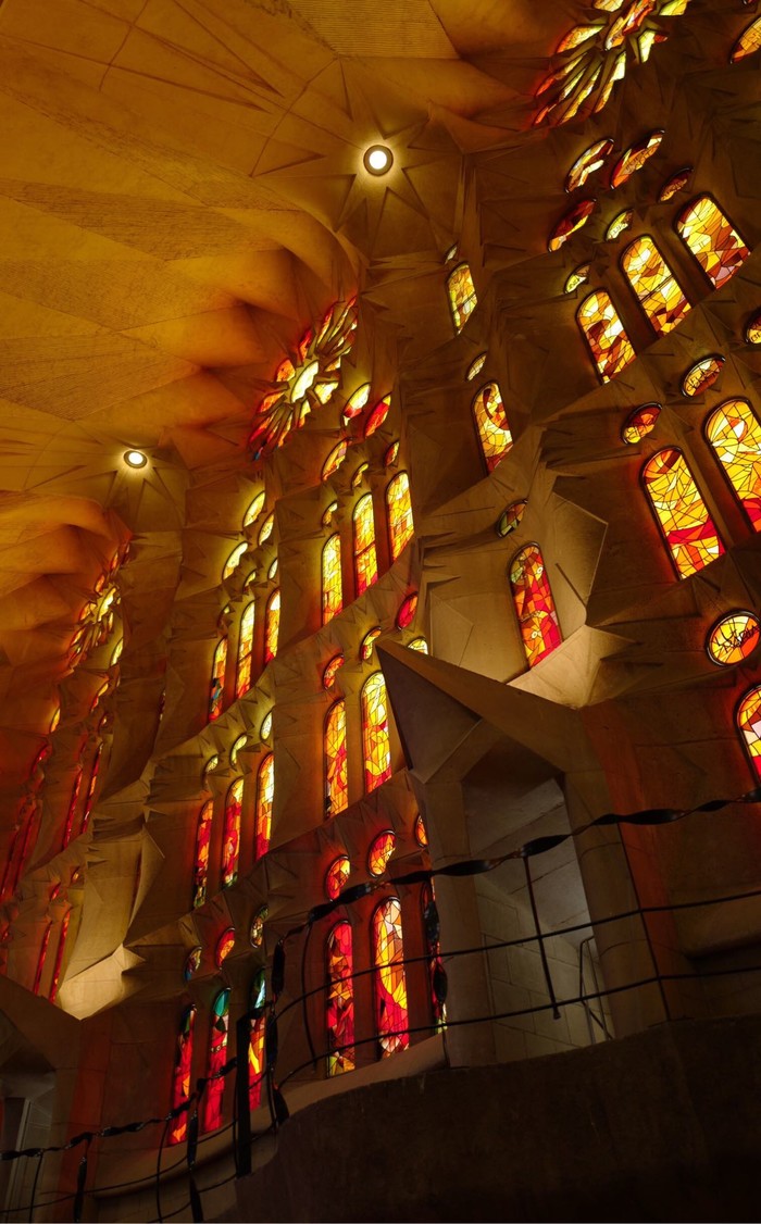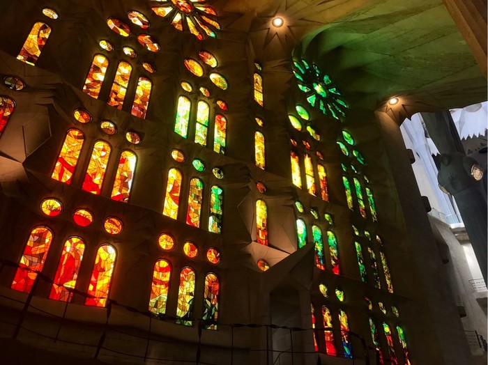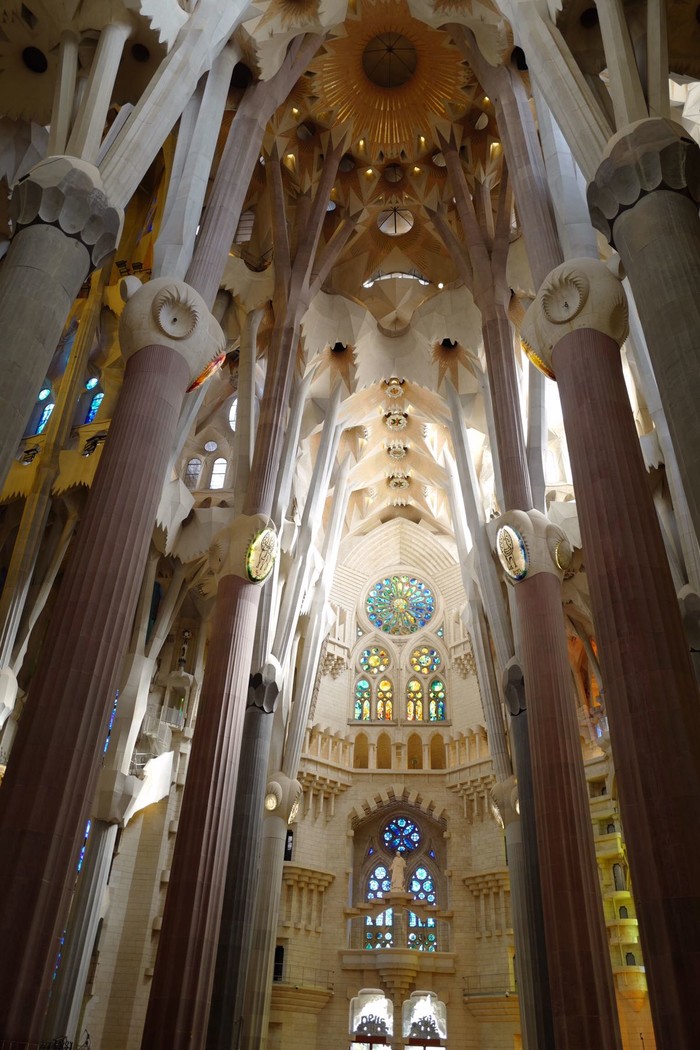 上午找了一家中国早餐店,吃了顿稀饭油条茶叶蛋哈哈,味道还是不错的。然后坐地铁两站去圣家堂大教堂。从地铁站乘电梯出来,大教堂就这样缓缓的出现,直接惊讶无需准备。老公说外立面其实有点慎的感觉,不过后来进去后完全是另一种感觉。按票时间来门口排队入场,我们入场时间是10:30的,大概是10:15到的。门口人山人海,发现排队队伍站队。当时我前面的老外一家人,男士看我手里是10:30 他们是45分,让我排他们前面,他们ok。奈斯哦~人虽然很多,但排队安检进去还是很快的。进去后除了震撼就是震撼,光与影,色彩的过渡变换,结构的处理,教堂空间的气势与恢弘,以前看过佛罗伦萨的教堂已经觉得很惊叹了。没想到这次更震撼!高迪真是让人佩服之极。只是他没能在生前看到他作品的完成。照片拍出来虽然也很美,但那种身在其中的震撼只能靠身处其中去感受。教堂是一个主厅,一目了然。其实很快就可以参观完毕,后来我们在祷告的长椅上静静坐了许久。出发前翻攻略看到室内五彩光线照片,以为是p的,原来真不是。整个教堂里采光丰富,阳光透过五颜六色的玻璃窗在教堂内产生如色卡由冷到暖,由暖到冷真是漂亮。