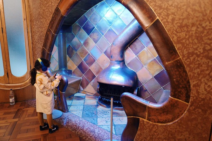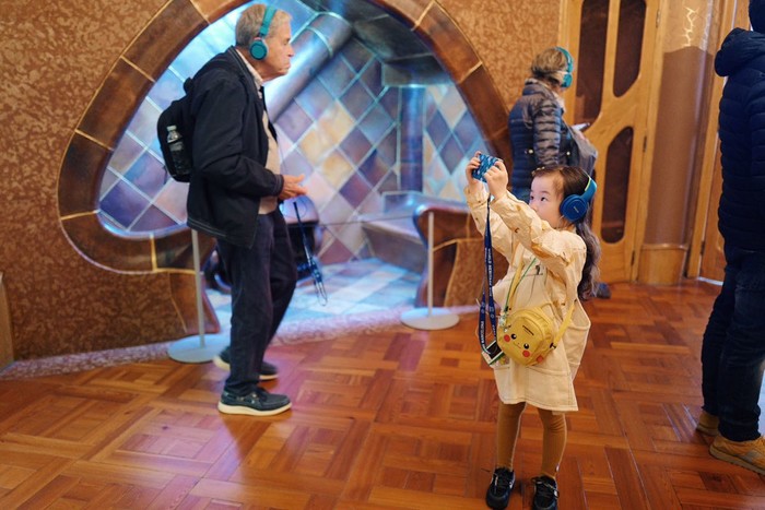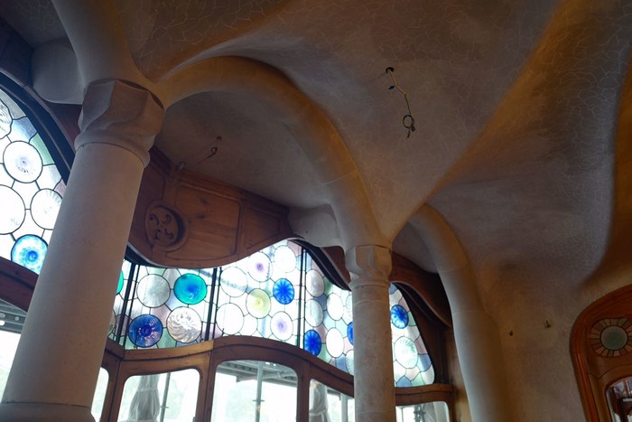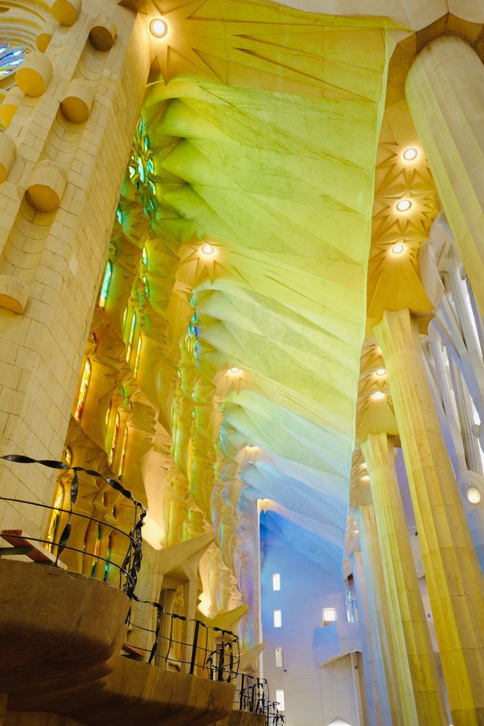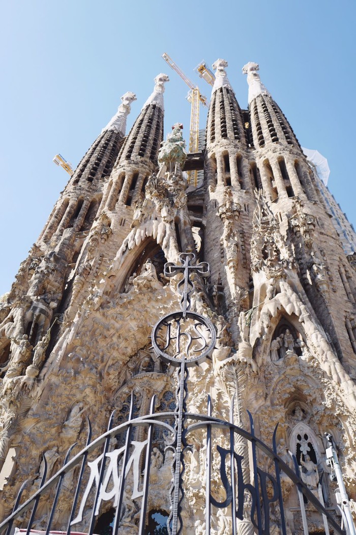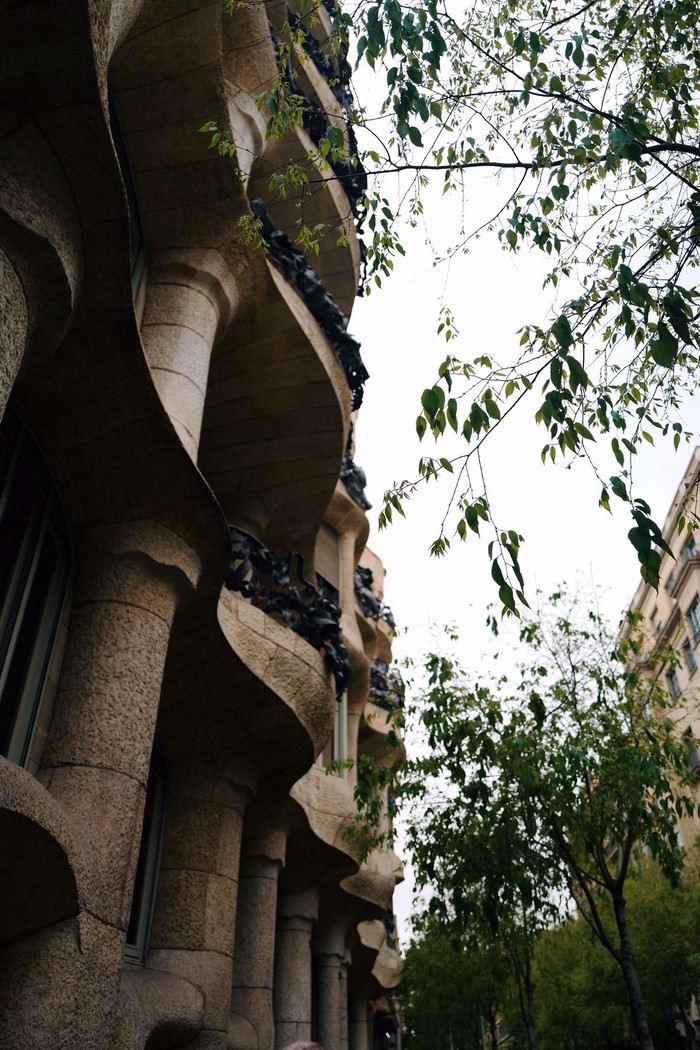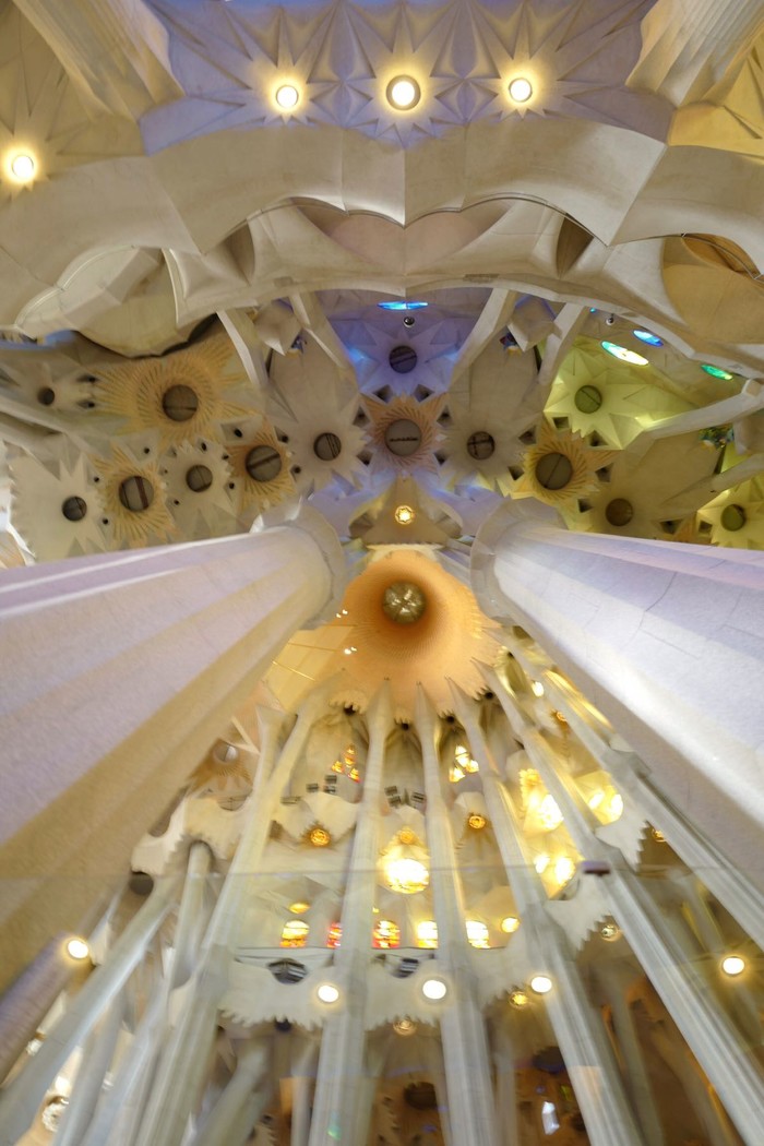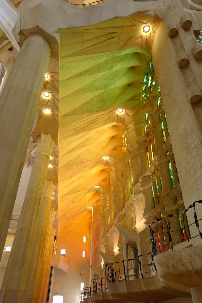 上午找了一家中国早餐店,吃了顿稀饭油条茶叶蛋哈哈,味道还是不错的。然后坐地铁两站去圣家堂大教堂。从地铁站乘电梯出来,大教堂就这样缓缓的出现,直接惊讶无需准备。老公说外立面其实有点慎的感觉,不过后来进去后完全是另一种感觉。按票时间来门口排队入场,我们入场时间是10:30的,大概是10:15到的。门口人山人海,发现排队队伍站队。当时我前面的老外一家人,男士看我手里是10:30 他们是45分,让我排他们前面,他们ok。奈斯哦~人虽然很多,但排队安检进去还是很快的。进去后除了震撼就是震撼,光与影,色彩的过渡变换,结构的处理,教堂空间的气势与恢弘,以前看过佛罗伦萨的教堂已经觉得很惊叹了。没想到这次更震撼!高迪真是让人佩服之极。只是他没能在生前看到他作品的完成。照片拍出来虽然也很美,但那种身在其中的震撼只能靠身处其中去感受。教堂是一个主厅,一目了然。其实很快就可以参观完毕,后来我们在祷告的长椅上静静坐了许久。出发前翻攻略看到室内五彩光线照片,以为是p的,原来真不是。整个教堂里采光丰富,阳光透过五颜六色的玻璃窗在教堂内产生如色卡由冷到暖,由暖到冷真是漂亮。