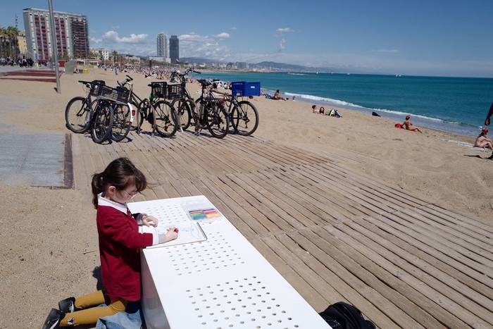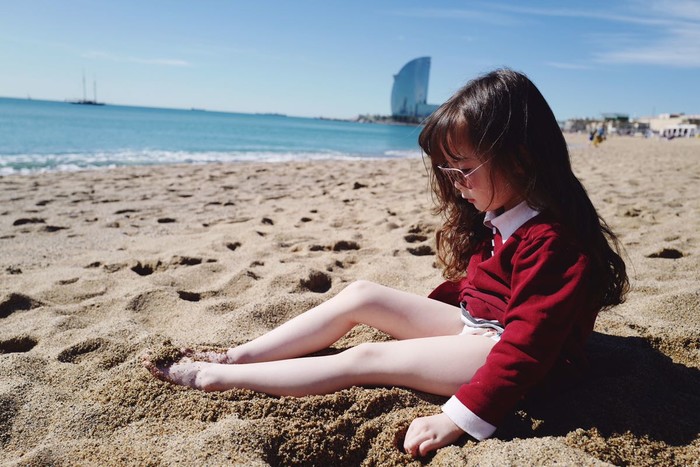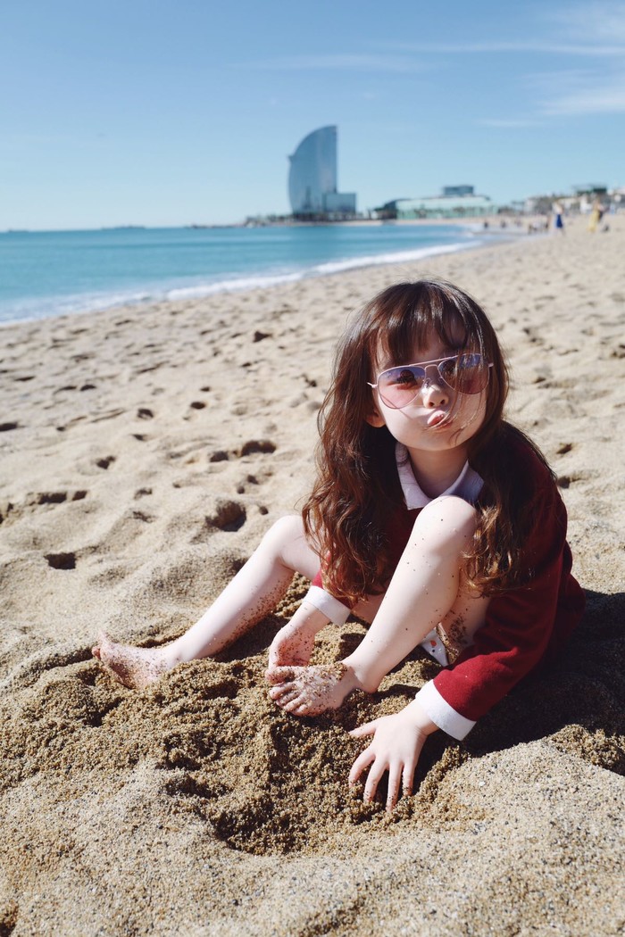因为没有及时网上购买这天的圣家堂大教堂参观门票,又不想人山人海排队,临时安排今天悠闲的在沙滩趟一天。早上酒店附近用了早餐,路边公交车几站直接坐到巴塞罗那塔海滩。顺着导航从住宅区的一条小路径直走想沙滩,临近小巷的末端,看到蔚蓝的大海映入眼帘,海天一色豁然开朗。我和女儿已经撇下老公奔向大海。要说小孩子最喜欢什么,榜上有名绝对的水和沙。所以大海,海滩对于小孩子而言,就是玩一天都不带够的。我们从上午9点多 一直玩到下午快4点,女儿依旧不愿意走,为娘都要晒干巴了。不过看过几次东南亚的海滩,海岛的沙滩,这地中海的海水颜色有些不同,沙不算很细,总体很美。午餐在海滩边的餐厅吃的海鲜,下午陪女儿海边画画,散步。上午的温度不太高人不太多,到了下午海滩上很多人在日光浴and裸晒。晒了一天,赶紧回酒店做个补水面膜,让孩子睡了会。