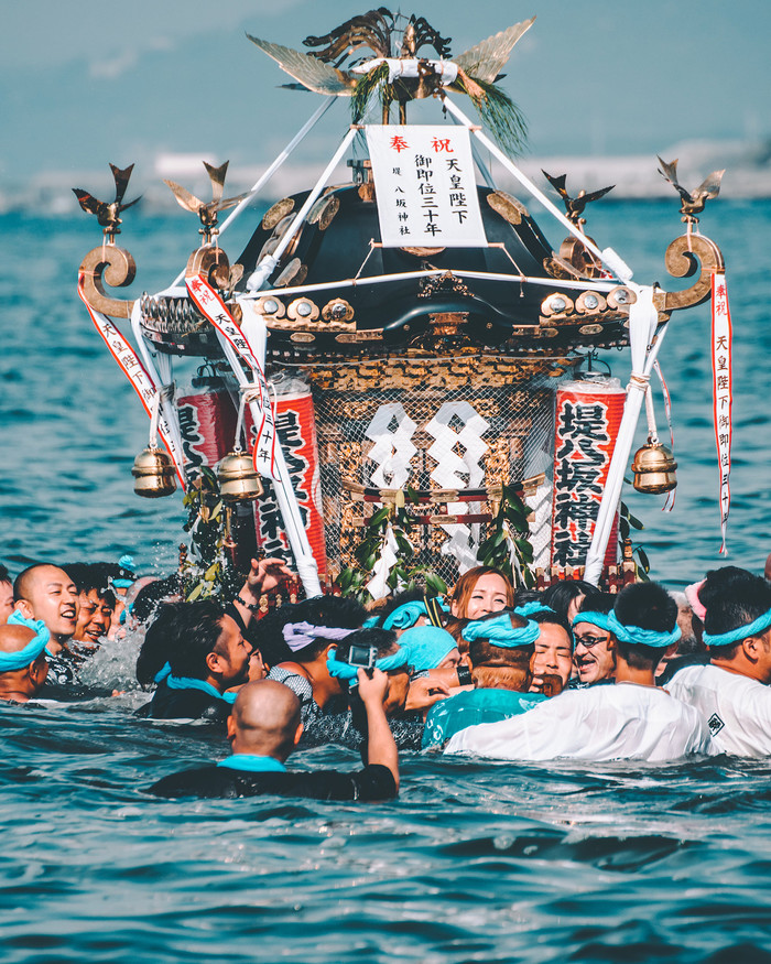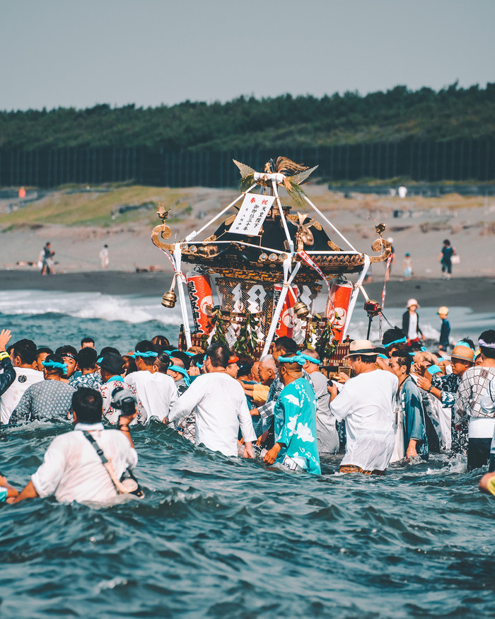 游神庆典活动——“滨降祭”,当地居民齐心协力抬着庙宇供奉的神舆到海上巡游,前进的哨声,居民的呐喊声夹杂着海浪的自然之声,希望获得“海的灵力”的神舆能保佑当地人的平安。