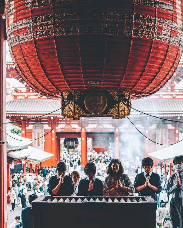 神社与寺庙,汇聚当地的居民及游客,参拜的信徒站立在拜殿正前方,行礼后轻轻摇铃唤醒神灵,往功德箱投入香钱,再双手击掌祈祷:“希望一如既往,万事胜意”。