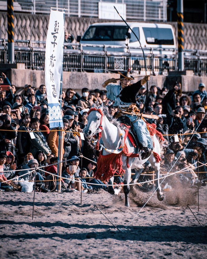 “流镝马”表演,武士们策马入场,向放置的三个标靶接连放箭,场面惊心动魄又热闹至极。