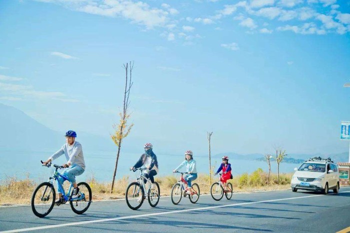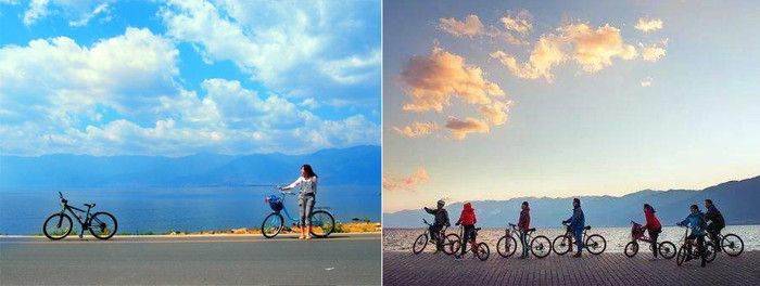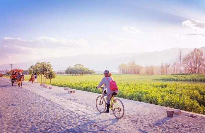 早起当阳光穿过客栈的白墙黑瓦打在床上,你可以伸个懒腰慢慢起床,也可以赶个早,在店铺还未开始营生前,踏着青石板,看看静谧古朴的洱海晨景。周围有玉几岛、金梭岛、风情岛等岛屿。在玉几岛上有舞蹈家杨丽萍的私人别墅和画家赵青的青卢。静谧是双廊的特色,小小的渔村不用去刻意去寻找什么景色,只有你拥有一颗善于发现的心,那处处便是风景。处处便是惊喜。睡饱了或者玩累了,我们可以开始另外一段环洱海之旅。环洱海骑行自行车前往【挖色镇】,挖色镇是完全原生态的小镇。从双廊到挖色这一段,公路平坦,路上偶尔也见蓝天碧水,暖阳轻风,洱海的波光粼粼,反正怎么形容我觉得都不过分。一路上也会依旧想念过往的时光,但又会义无反顾地向前,考验着自己的意念。沿着洱海,一路骑行,漫不经心的看海,吹风,听歌,这或许就是我们这次旅行感觉最美的一件事。