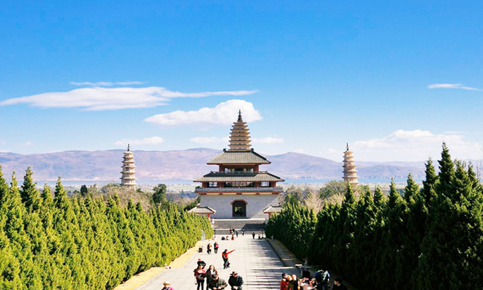 早起7点30分准点出发,约11点30分到达大理古城,中午开始游玩大理古城,除了寻找【古城门楼】、【五华楼】和【洋人街】外,还可以到古城里的农贸市场寻找各种当地小吃。景区游玩2小时,并吃完中餐。14点左右出发到达【崇圣寺三塔】,崇圣寺初建于南诏丰佑年间(公元824-859年),大塔先建,南北小塔后建,寺中立塔,故塔以寺名。现寺的壮观庙宇在咸同年间已毁,只有三塔完好地保留下来。崇圣寺以寺中三塔闻名于世,又称“大理三塔”,是中国著名的佛塔之一,三塔由一大二小三座佛塔组成,呈鼎立之态,远远望去,雄浑壮丽,是苍洱胜景之一。先在崇圣路上看看壮观的三塔远景后,我们漫步进入公园内,近距离观赏三塔倒影的倩影,然后步入最高的塔楼,远观整个大理古城和苍山洱海的美景。
