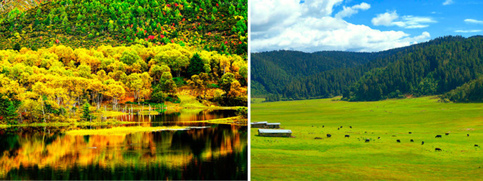 【普达措国家森林公园】国家级风景名胜区,公园内风景优美,原始生态环境保存完好,既有明镜般的高山湖泊、水美草丰的牧场,也有百花盛开的湿地和茂密的原始森林。每年的春秋两季,是游览普达措的最佳时节。春季,五颜六色的杜鹃花铺满山坡,秋季的普达措,则是一片五彩斑斓的景象。