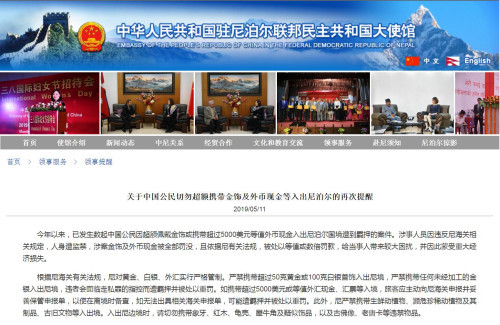 中使馆吁中国公民勿超额携带金饰或现金出入尼泊尔