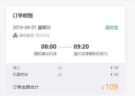 揭阳-温州,单程含税109元