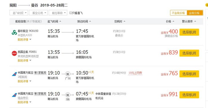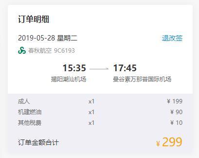 揭阳-曼谷,单程含税299元,跟飞猪上同日期价格相比,还是要便宜一些~