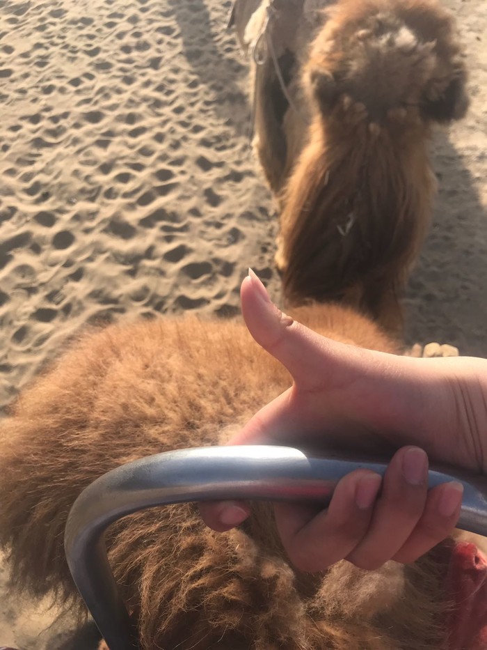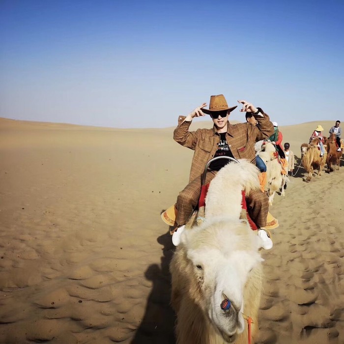 小插曲过,进入景区前碰到很多小商贩跟你说里面必须要鞋套等等,并不需要,不过防晒倒是必须的,最好是一顶遮阳帽,口罩和太阳镜长衣长袖全副武装,否则骑着骆驼赶往月牙泉的途中你会被紫外线好好疼爱一番,机智的小哥哥涂好防晒后里三层外三层(临时门口购十元骑士帽)